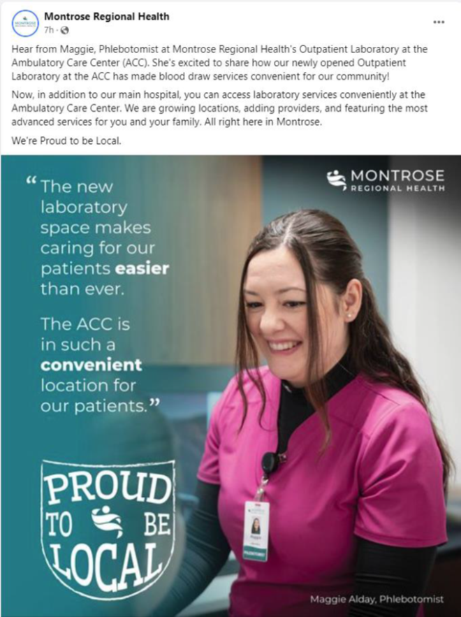 Montrose Regional Health's Laboratory is The Joint Commission (TJC) accredited, high complexity laboratory. The laboratory serves Western Colorado, and operates and advises a few regional clinic laboratories. We also provide outreach laboratory services to non-Montrose Regional Hospital health facilities in the region.